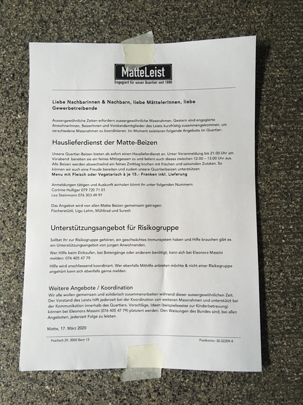 Dieses Flugblatt hängt in meinem Quartier seit dem Lockdown. Das Streben des Matte-Leistes in dieser speziellen Zeit hat mich sehr berührt: Solidarität zählt jetzt mehr denn je! Darauf habe ich mich selber engagiert und kaufe seitdem für ein älteres Ehepaar aus der Matte ein.
