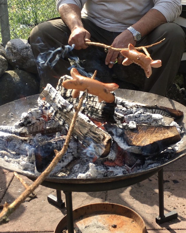 Cervelat am Holzstecken über der Feuerschale zu Hause im Garten brätle😊